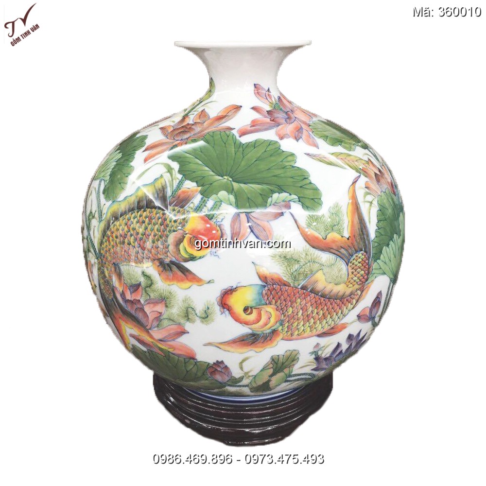 Bình phong thủy cao cấp vẽ cá chép sen, có thân tròn đầy đặn, được làm từ chất sứ cao cấp gốm Bát Tràng, được nung ở nhiệt độ 1300 độ C , chất sứ dầy dặn, bề mặt sứ sán bóng, mặt sứ màu trắng hoa văn cá chép được vẽ bằng tay với đường nét tinh sao